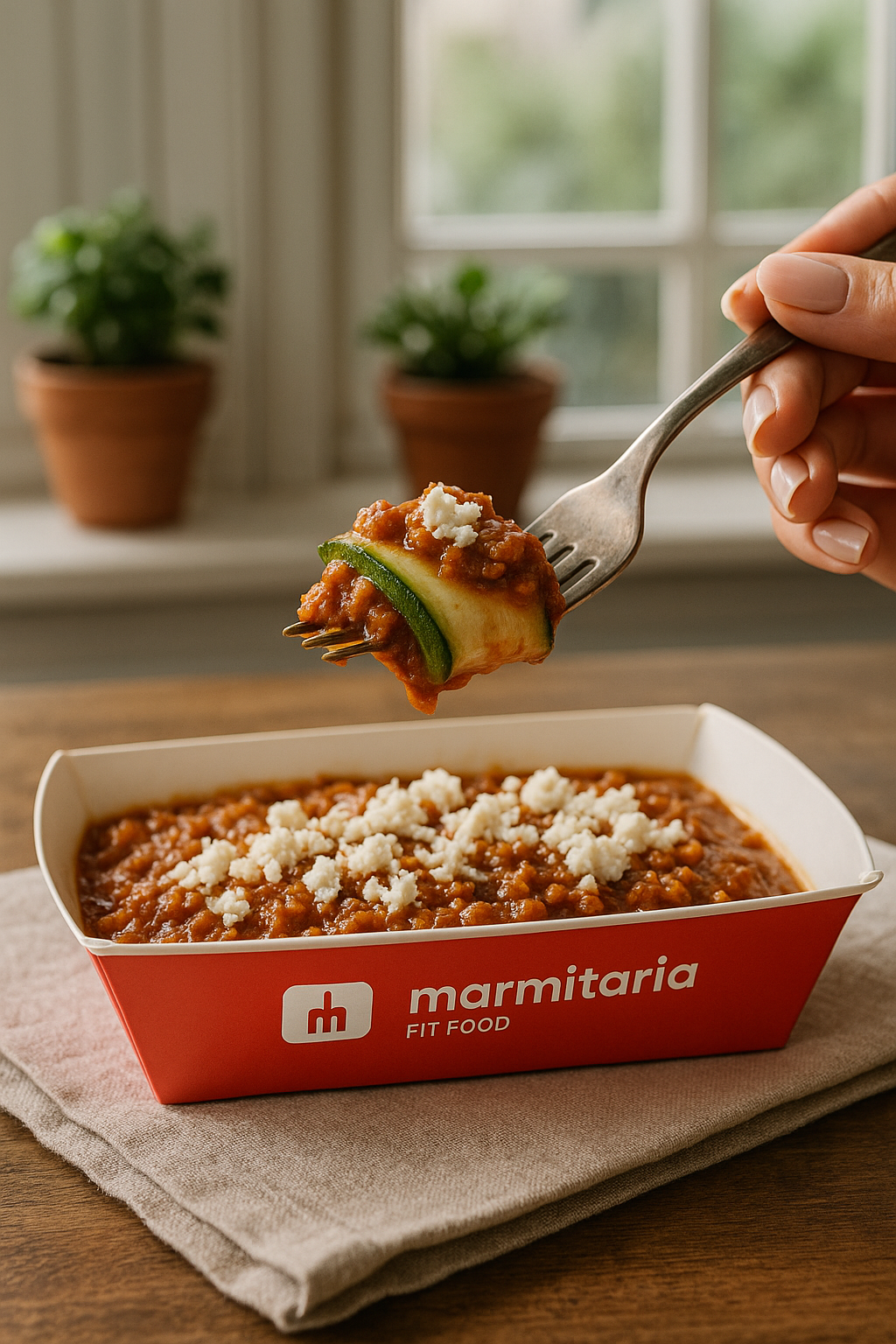 Ideal para quem busca uma refeição nutritiva, a Lasanha de Abobrinha com molho a Bolonhesa da Marmitaria Fit Food é uma ótima opção para almoços ou jantares leves, sem comprometer o sabor ou a dieta.